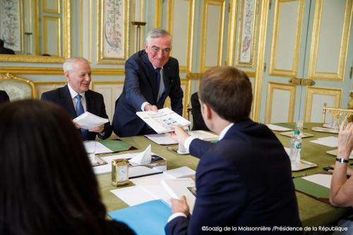 Le premier président Bertrand Louvel, président de la formation compétente à l’égard des magistrats du siège, et le procureur général Jean-Claude Marin, président de la formation compétente à l’égard des magistrats du parquet, ont été reçus au palais de l’Elysée, le 27 juin 2018, afin de remettre au Président de la République, Emmanuel Macron, le rapport d’activité du Conseil supérieur de la magistrature pour l’année 2017, en présence de Madame Nicole Belloubet, garde des Sceaux, ministre de la justice.
