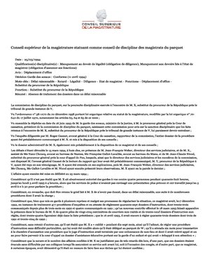 Parquet Avis n° P021 - 25/03/1994 Déplacement d'office Lire la décision Sanction Déplacement d'office Manquements Conscience professionnelle Fonction Substitut du procureur de la république