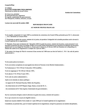 Requête en annulation de la décision du garde des sceaux ayant prononcé la sanction de mise à la retraite d’office du magistrat et de celle du Président de la République l’ayant radié des cadres de la magistrature aux motifs allégués d’un non respect du cadre de la saisine initiale du CSM, des règles gouvernant la publicité de l’audience et du principe de la présomption d’innocence ainsi que d’une erreur manifeste d’appréciation dans le choix de la sanction. Détention et transmission d’images pédophiles
