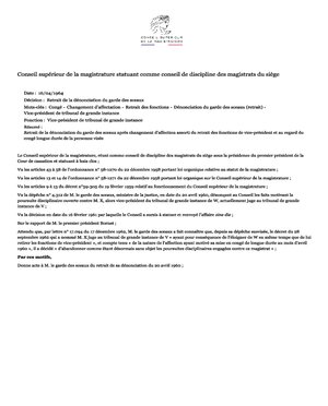 Retour Retrait de la dénonciation du garde des sceaux après changement d’affection assorti du retrait des fonctions de vice-président et au regard du congé longue durée de la personne visée Partager Imprimer