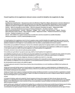 Le Conseil supérieur de la magistrature, réuni à la Cour de cassation comme conseil de discipline des magistrats du siège, pour statuer sur les poursuites disciplinaires engagées par M. le premier président de la cour d’appel de V et le garde des sceaux, ministre de la justice, contre M. X, président de chambre à la cour d’appel de V, sous la présidence de M. Guy Canivet, premier président de la Cour de cassation ;