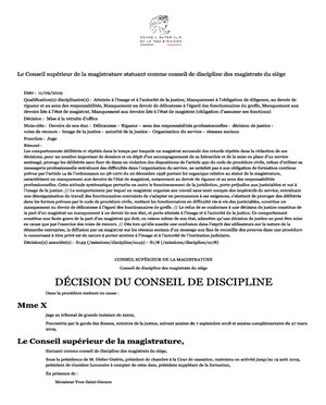 Les comportements délibérés et répétés dans le temps par lesquels un magistrat accumule des retards répétés dans la rédaction de ses décisions, pour un nombre important de dossiers et en dépit d’un accompagnement de sa hiérarchie et de la mise en place d’un service aménagé, proroge les délibérés sans fixer de dates en violation des dispositions de l'article 450 du code de procédure civile, refuse d’utiliser sa messagerie professionnelle entraînant des difficultés dans l’organisation du service, ne satisfait pas à son obligation de formation continue prévue par l'article 14 de l'ordonnance no 58-1270 du 22 décembre 1958 portant loi organique relative au statut de la magistrature, caractérisent un manquement aux devoirs de l'état de magistrat, notamment au devoir de rigueur et au sens des responsabilités professionnelles. Cette attitude systématique perturbe en outre le fonctionnement de la juridiction, porte préjudice aux justiciables et nui à l'image de la justice. // Le comportement par lequel un magistrat organise son travail sans tenir compte des impératifs du service, entraînant une désorganisation du travail des fonctionnaires contraints de s'adapter en permanence à ses exigences, s’abstient de proroger des délibérés dans les formes prévues par le code de procédure civile, mettant les fonctionnaires en difficulté vis-à-vis des justiciables, constitue un manquement au devoir de délicatesse à l’égard des fonctionnaires de greffe. // Le refus de se conformer à une décision de justice constitue de la part d'un magistrat un manquement à un devoir de son état, et porte atteinte à l'image et à l'autorité de la justice. Ce comportement constitue une faute grave de la part d'un magistrat qui doit, en raison même de son état, admettre qu'une décision de justice ne peut être mise en cause que par l'exercice des voies de recours. // Dès lors qu’elle suscite une confusion dans l'esprit des utilisateurs sur la nature de la démarche entreprise, la diffusion par un magistrat sur les réseaux sociaux d'un message aux fins de recueillir des preuves dans une procédure le concernant à titre privé est de nature à porter atteinte à l'image et à l'autorité de l'institution judiciaire.