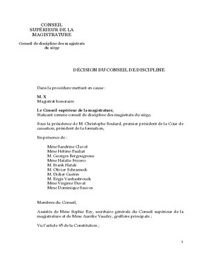 Décision n° S081 - 14/12/1994Sur les exceptions de nullité déposées par le conseil de M. X, le Conseil a tout d’abord rappelé qu’il était saisi aux termes de l’article 50-1 de l’ordonnance statutaire par la dénonciation des faits motivant les poursuites disciplinaires adressées par le garde des Sceaux, ministre de la Justice lequel n’a pas à faire valoir un quelconque intérêt à agir, n’agit pas pour le compte des magistrats concernés par des termes outranciers et n’a nul besoin d’avoir, en ces circonstances, un mandat pour agir ou une procuration. Puis, le Conseil, pour rejeter l’atteinte aux droits de la défense qui résultant des termes trop généraux et imprécis de la saisine, a relevé que cette dernière citait au contraire très précisément plusieurs extraits de l’interview du magistrat sur une chaîne télévisée ainsi que d’autres passages de son livre et énonçait les qualifications disciplinaires que le garde des Sceaux entendait retenir. Par ailleurs, le Conseil a rappelé qu’il n’était pas saisi d’une action en diffamation mais d’une procédure disciplinaire et qu’en conséquence le délai de prescription de l’action était de trois ans conformément à l’article 47 de l’ordonnance statutaire, il en résultait que les faits en cause n’étaient pas atteints par la prescription. Enfin, le Conseil a réaffirmé qu’il était saisi pour connaître de l’ensemble du comportement du magistrat et n’était pas limité aux seuls faits décrits par la saisine. Le rapporteur peut ainsi relever des faits non mentionnés dans la saisine initiale mais révélés au cours de l’enquête, sous réserve que soient respectés les droits de la défense. En l’espèce, la nouvelle pièce intégrée en procédure avait été portée à la connaissance des parties dans un délai raisonnable permettant la préparation de sa défense. Le Conseil a rappelé que la liberté d’expression de tout citoyen bénéficiait d’un niveau élevé de protection, notamment par le truchement des articles 11 de la DDHC et 10 de la CEDH mais que pour un magistrat, cette liberté devait être conciliée avec leur devoir de réserve prévu par l’article 10 de l’ordonnance statutaire. Le magistrat, dans son expression publique ou bien dans son ouvrage, en critiquant sévèrement l’institution judiciaire a tenu des propos outranciers, caricaturaux voire outrageants notamment à l’égard des femmes magistrates et a asséné comme vérités des éléments non objectivés, non caractérisés, non étayés et procédant systématiquement par jugements de valeur sans démonstration, caractérisant donc un manquement au devoir de réserve. Egalement, en usant de qualificatifs animaliers pour parler de ses collègues magistrats, M. X a montré le mépris ressenti pour ceux-ci et a manqué à son devoir de délicatesse. Enfin, ces écrits particulièrement inadaptés lorsqu’il relate ses audiences correctionnelles ou quand il présente les magistrats du ministère public comme « des petits soldats » ou bien lorsqu’il énonce que le système informatique décide des sanctions à la place du magistrat, caractérisent une atteinte à la confiance et au respect que la fonction de juge doit inspirer et par là-même une atteinte à l’image et à l’autorité judiciaire.