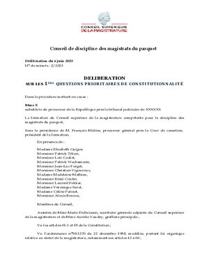 Le Conseil supérieur de la magistrature a déclaré irrecevable les questions prioritaires de constitutionnalité déposées par la magistrate poursuivie, au motif, qu’en l’état actuel des textes, sa formation compétente à l’égard des magistrats du parquet ne constitue pas une juridiction au sens de l’article 61-1 de la Constitution.