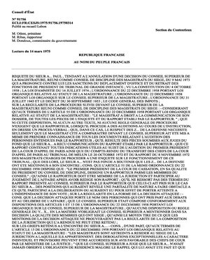 Décision n° S032 - 09/05/1973Demande d’annulation de la décision par laquelle le Conseil supérieur de la magistrature a prononcé une sanction disciplinaire en raison de l’absence de consignation dans un procès-verbal de l’audition de témoins, de la partialité du rapporteur, de l’irrégularité des mentions afférentes à la composition du Conseil et d’une appréciation contestable des faits. Négligences d’un chef de juridiction consistant, notamment, à ne pas respecter l’obligation de résidence, à se désintéresser de la gestion de sa juridiction et à refuser l’application de dispositions nouvelles au mépris d’instructions reçues de son premier président. Mention sur la minute d’un jugement de la présence d’un magistrat n’ayant ni siégé ni délibéré