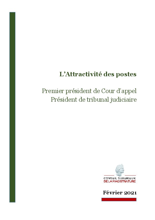 Rendu public en février 2021, le rapport s'attache à définir les fonctions de premier président et de président, qui restent souvent mal connues, à présenter les éléments susceptibles d’attirer les candidatures, avant de déterminer ce qui pourrait faciliter l’exercice des fonctions et améliorer les perspectives de carrière.