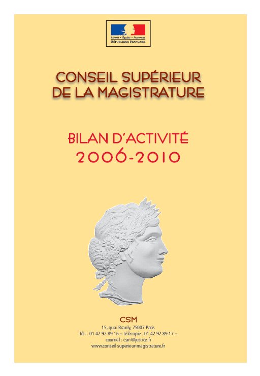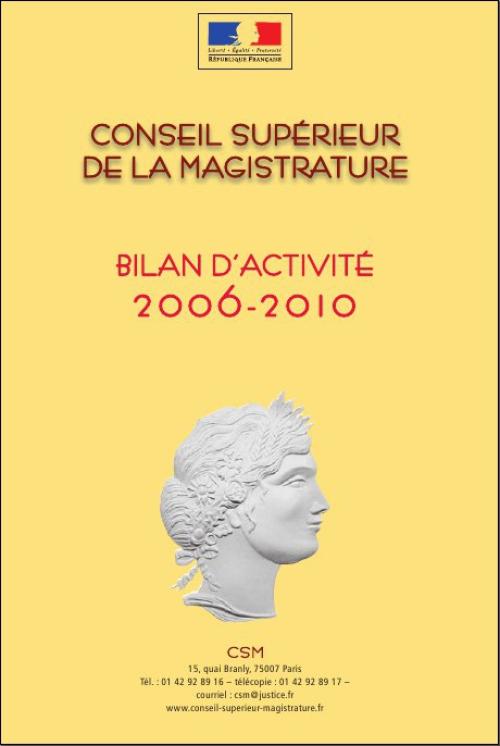 Le bilan de la mandature 2006-2010, présenté sous forme numérique, intègre le compte-rendu de l’activité des différentes formations du Conseil ainsi que la présentation de ses réflexions et propositions sur des problématiques concernant le statut, la situation et l’avenir du corps judiciaire.