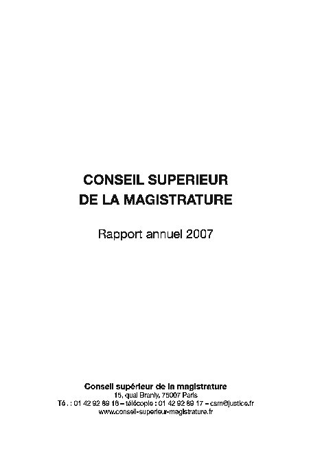L'article 20 de la loi organique du 5 février 1994 relative au Conseil supérieur de la magistrature prévoit la publication chaque année d'un rapport d'activité des formations de ce Conseil.Le rapport couvre la période du 1er janvier au 31 décembre 2007.Outre les principaux aspects de l'exercice des attributions du Conseil en matière de nomination et de discipline des magistrats, le rapport présente des réflexions sur la réforme constitutionnelle de modernisation des institutions de la Ve République le concernant, ainsi que sur les Français et leur justice. Il consacre une étude à la crise de confiance que traverse l'institution judiciaire et s'appuie sur un sondage exclusif réalisé à cet effet.