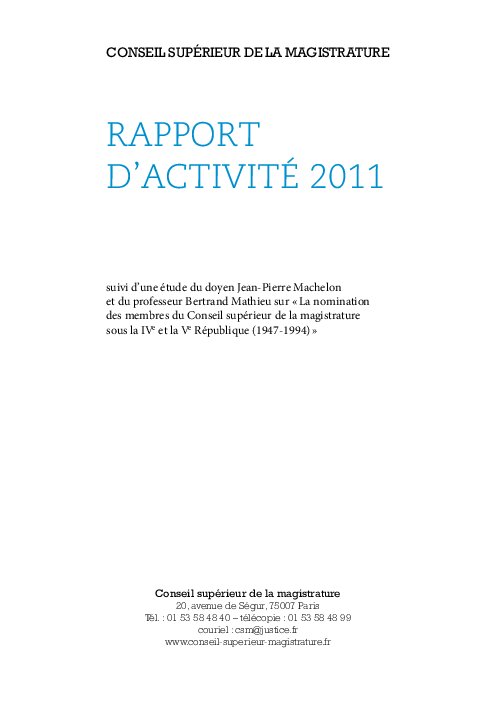 Ce document couvre la période du 1er janvier au 31 décembre 2011.Conçu comme un outil de travail, ce rapport détaille les règles et pratiques du CSM en matière de nominations, de discipline des magistrats et de plaintes de justiciables.